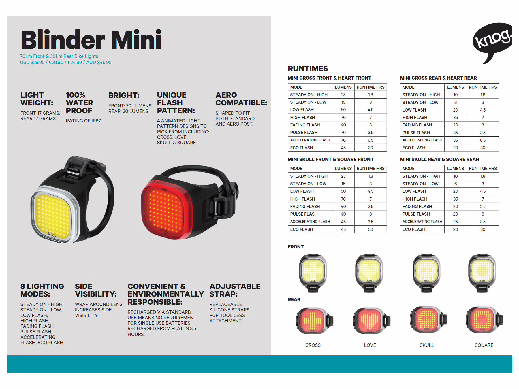 Sada KNOG Blinder Mini ponúka kompaktné predné (50 lm) a zadné (30 lm) svetlo s modernou COB technológiou. Svetlá disponujú 7 režimami, integrovaným USB nabíjaním bez káblov a extrémnou výdržou až 60 hodín v režime eco-flash. Sú 100 % vodotesné, vážia iba 17 g a vďaka univerzálnym gumičkám pasujú aj na aero profily.