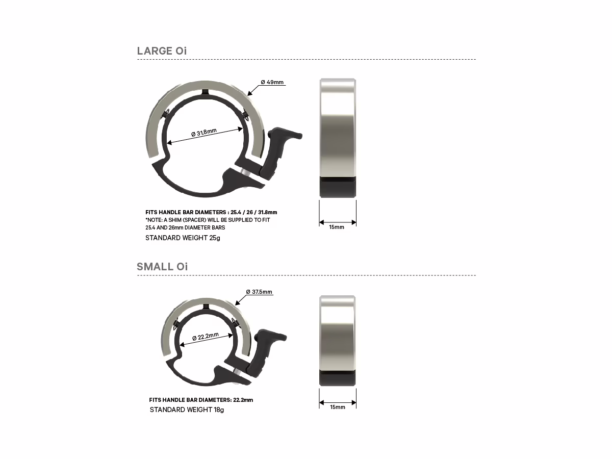 Malý zvonček Oi sa hodí na riadidlá s priemerom 22,2 mm, čo je napr. horský bicykel (blízko gripov), BMX a klasické mestské bicykle. Veľký zvonček Oi sa hodí na riadidlá s priemerom 23,8 až 31,8 mm, napr. cestné bicykle a niektoré mestské bicykle.
