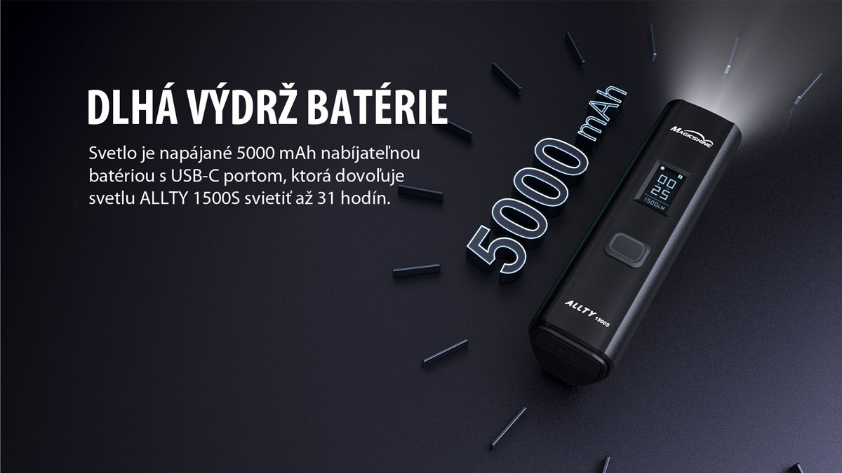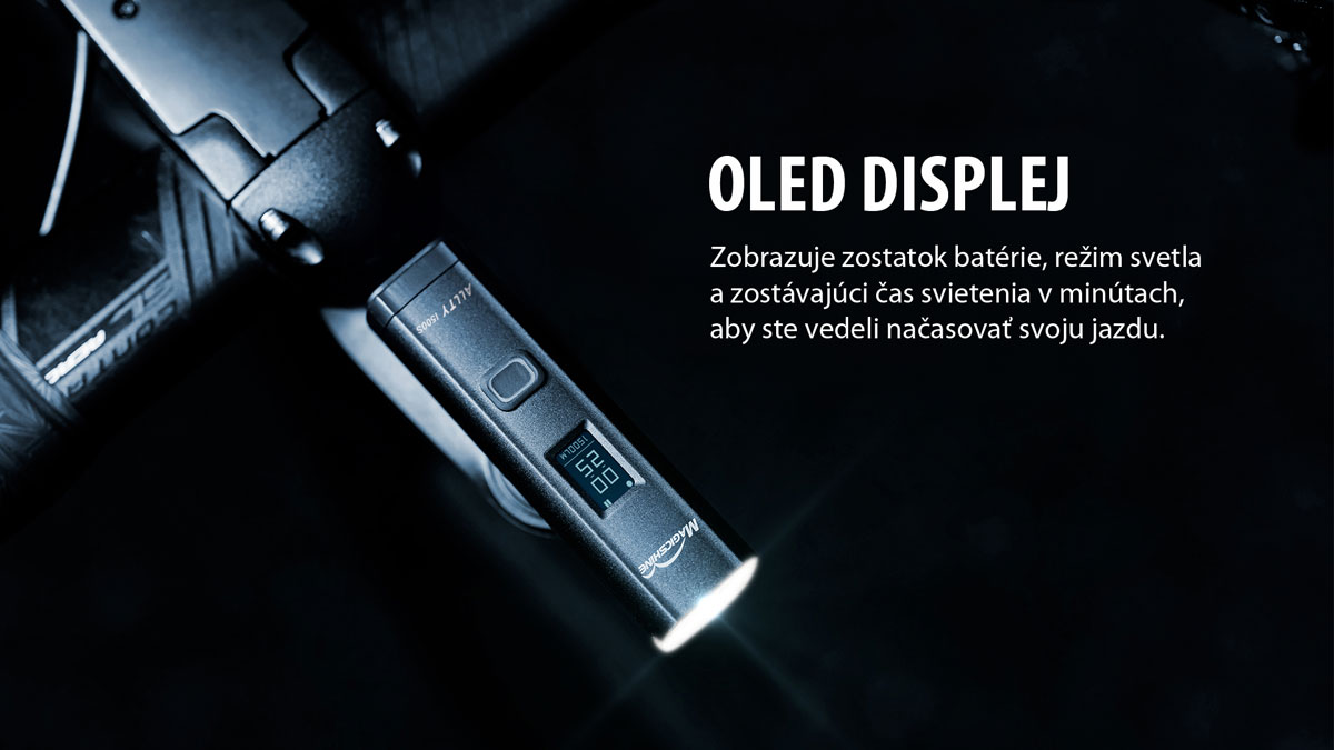 • OLED displej: Integrovaný displej priamo na tele svetla zobrazuje zvolený režim, percentuálny stav batérie a presný čas zostávajúcej prevádzky.