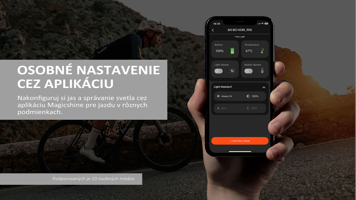 Smart aplikácia a ovládanie: Možnosť prispôsobenia svetelných režimov cez aplikáciu Magicshine a pohodlné bezdrôtové ovládanie priamo z riadidiel (súčasť balenia).