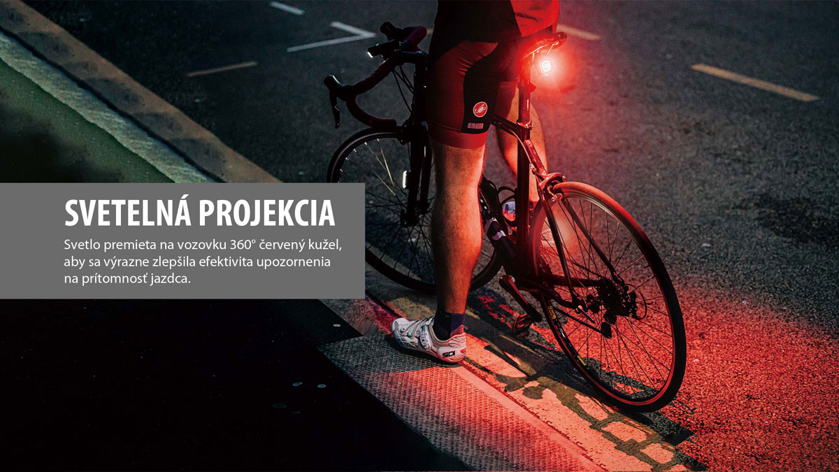 OptiTracing: Špeciálna spodná šošovka premieta 360-stupňový oblúk červeného svetla priamo na cestu pod bicyklom, čím vytvára výraznú bezpečnostnú zónu.